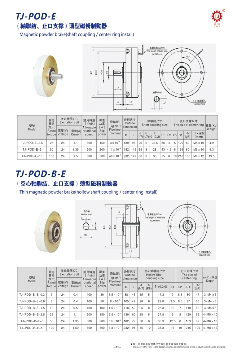 東莞天機傳動廠家生產(chǎn)的空心軸薄型磁粉剎車器又稱止口支撐薄型磁粉剎車器,額定轉(zhuǎn)矩:3-100N.m;額定電壓:DC24V;激磁線圈電流:0.4-1.5A。適用于放卷張力控制,磁粉剎車器還經(jīng)常被用于傳動機械的測功加載和制動等。